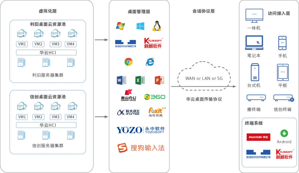 产品架构包括虚拟化层、桌面管理层、会话协议层和访问接入层。