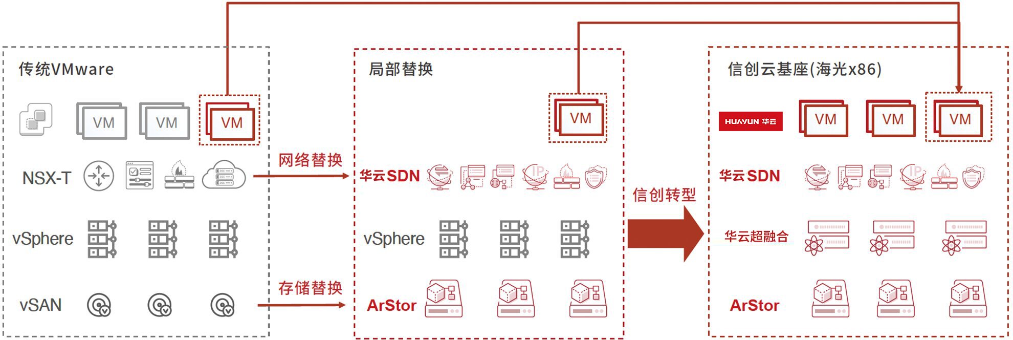 用户现有的VMware业务运行环境,信创云基座可以实现从局部替换到全面转型的实施路径。